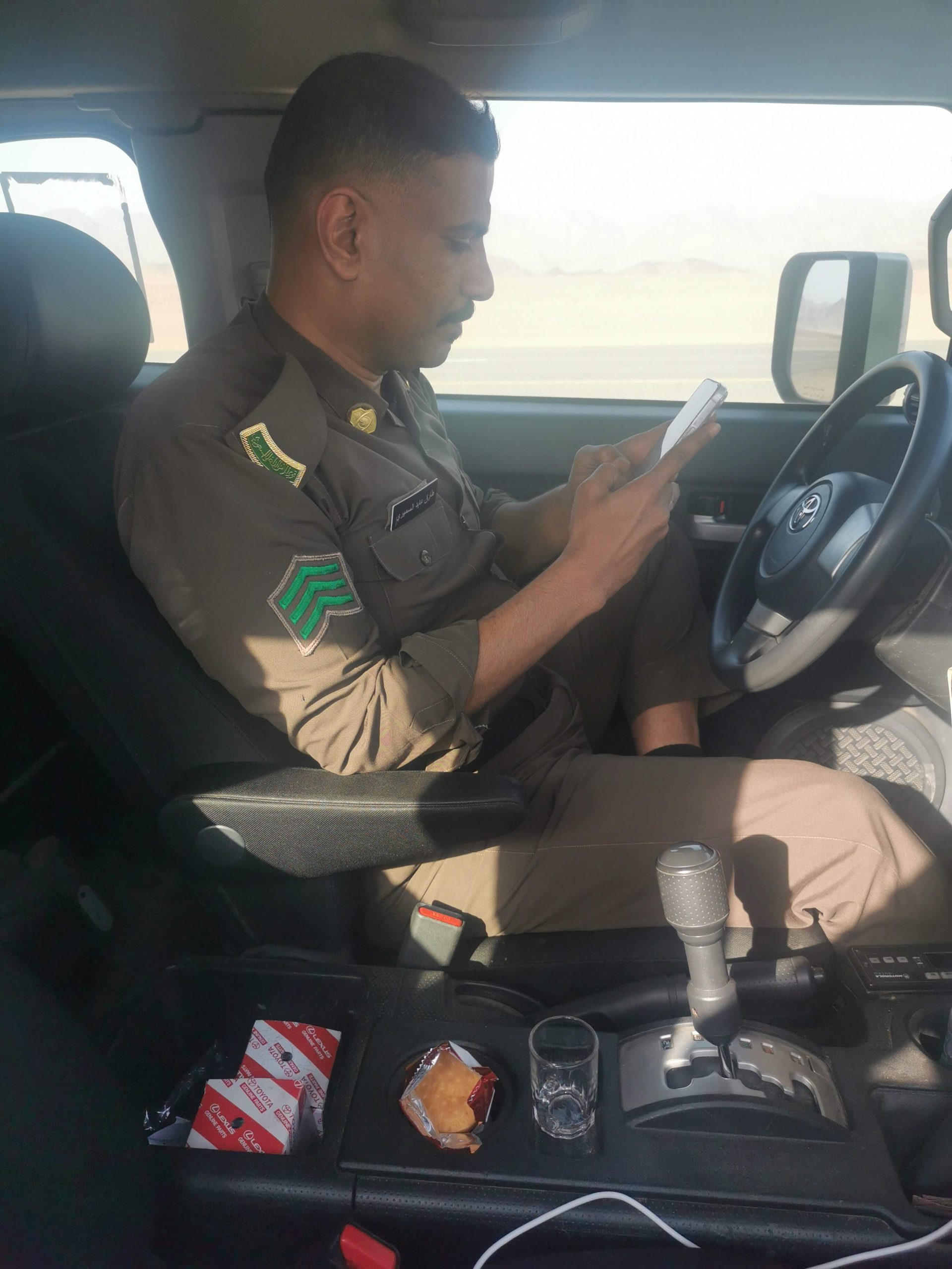 Am Abend eskaliert die Situation als sie mit Scheinwerferlicht vor der Moschee beginnen die Nacht im Auto zu verbringen. Ich verstaube sie… Am nächsten Morgen wache ich um 5h auf und wieder das gleiche Bild. Im Abstand von ca. 200 Metern sehe ich das Licht vom Polizeiwagen. Ich frühstücke und gehe los, die schurta schön langsam hinter mir. Zumittag habe ich dann die Gelegenheit mit Mohammed, dem Polizisten zu reden. Er erklärt mir, dass er mir noch 7 km folgen wird, dann übernimmt ein anderer Polizist meine Bewachung. Als die 7 km um sind sehe ich schon das nächste Polizeiauto kommen und sehe wie sie sich lange unterhalten. Dann stellt sich mein neuer Bewacher bei mir vor und ich erkläre ihm im Guten wieder, dass ich es sehr schätze, Ihr Gast zu sein, etc aber letztlich Ihre und seine Hilfe nicht brauche. Ich glaube sie meinen es wirklich nicht böse und machen nur ihren Job. Helfen tut mir das aber herzlich wenig. Ich merke allerdings, dass sich mit diesem Polizisten besser reden lässt und er es fast einsieht, dass er hier überflüssig ist. Letztlich bleibt ein Tourguide aus Jeddah bei mir stehen und reicht mir Datteln und Wasser. Während er sich für meine Geschichte interessiert, kommt auch schon mein neuer ‚Beschützer‘ vorbei. Um nicht zu sagen, ein saudischer Aufpasser :-))) Der Tourguide versteht meine Situation und ich bitte ihn ein Wort für mich einzulegen. Dann hat dieser Tourguide eine blendende Idee. Er zückt das Handy und fragt ob er ein Video/Interview mit mir machen kann um es in Snapchat zu posten. Ich willige gerne ein und ab diesem Moment ändert sich die Meinung des Aufpassers schlagartig. Die Polizei will um jeden Preis im Netz einen guten Eindruck abgeben. Schon gar nicht will sie den Eindruck erwecken, einem ausländischen Reisenden Probleme zu bereiten. Plötzlich sei es auch kein Problem mehr, dass ich alleine weiter gehen kann, etc.. Letztlich sind alle zufrieden und gehen von dannen. Ab diesem Zeitpunkt habe ich den Polizisten nicht mehr gesehen. Es scheint sie lassen jetzt los von mir, inshallah… Ich glaube es erst wenn ich in Medina und Jeddah bin!