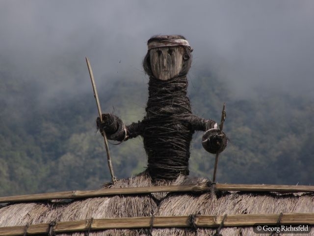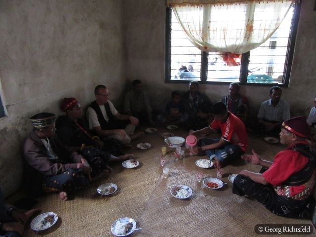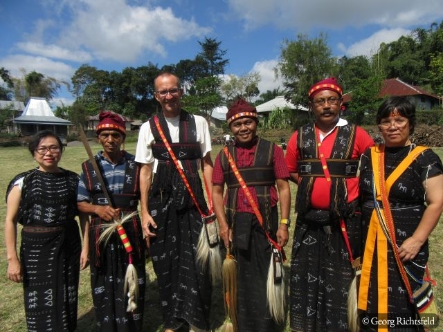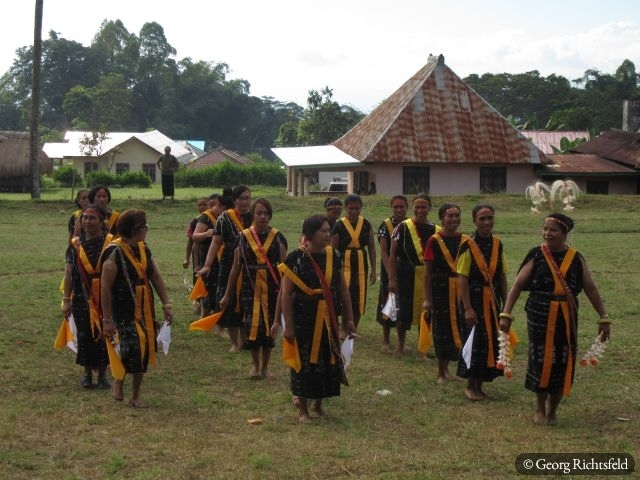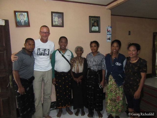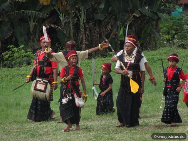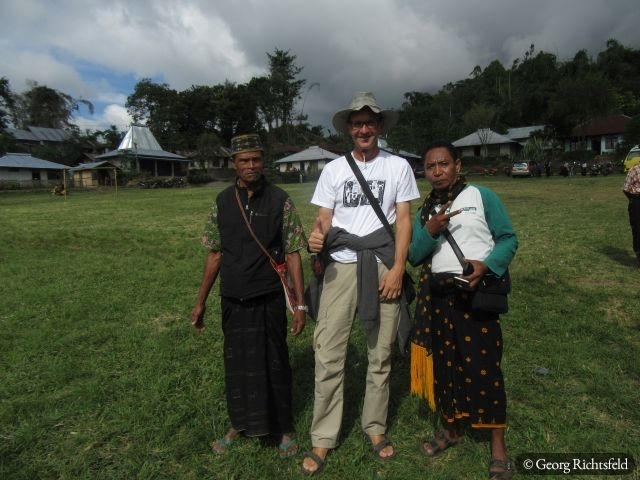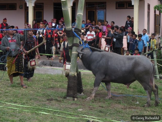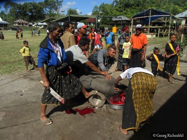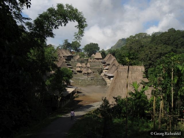 Nach 10 Stunden Busfahrt ueber kurvige und bergige Strassen, die immer wunderschoene Ausblicke bieten, erreiche ich Bajawa, eine kleine Stadt inmitten der Ngada Provinz. Ein Einheimischer nimmt mich am naechsten Tag auf seinem Motorrad mit nach Bena und in ein abgelegenes Dorf an der Kueste, ‚Hello Mister‘, ‚Hello Mister‘ toent es von vielen Leuten, natuerlich vor allem von Kindern… An einem Abend lerne ich in Bajawa einen Indonesier aus Jakarta kennen, der mir erzaehlt, dass es im nahegelegenen Dorf Menge in den naechsten drei Tagen ein Fest gibt und ich gerne willkommen sei. Ich lass mich nicht zweimal bitten und fahre mit seiner Familie in dieses Dorf wo bereits rituelle Taenze abgehalten werden als wir ankommen und ein wenig spaeter auch noch ein Wasserbueffel und ein Schwein geopfert werden. Es wird uns erzaehlt, dass es eine Art Hauseinweihungsfeier ist und morgen jeder der 32 hier ansaessigen Clans zusaetzlich noch ein Schwein opfern (schlachten) wird. Es werden dann naechsten Tag nochmals 29 Schweine und zusaetzlich 3 Wasserbueffel, es fliesst viel Blut und es herrscht fast Festtagsstimmung… Von einem Einheimischen, der jetzt in Bali lebt, werde ich in sein Elternhaus eingeladen, es gibt Hund in Blut und Kokusnussoel getraenkt und herausgebacken. Wir trinken Moke aus eine Kokosschale, ein leicht alkoholisches Getraenk, das von Palmen hergestellt wird und letztlich muessen wir auch noch den Arak, eine Art Reisschnaps verkosten, schmeckt alles sehr gut. Es ist hier Brauch sich gegenseitig ins Haus einzuladen und es wird viel geschwatzt, gelacht und eine gute Zeit verbracht. Wer weiss wann es wieder so ein Fest in diesem Dorf gibt, das letzte aehnliche Fest fand vor knapp 60 Jahren statt.